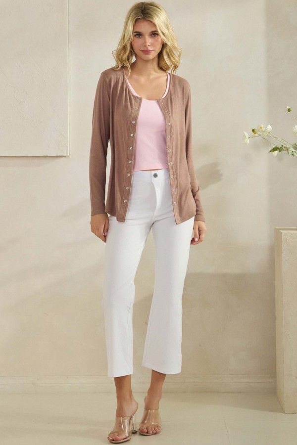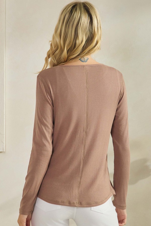 Soft, versatile, and effortlessly chic, this ribbed top can be perfectly styled as a top layer lightweight button up or worn alone as a polished everyday top. Crafted from a breathable, soft fabric, it features a relaxed-fit silhouette that drapes beautifully without feeling bulky. The scoop neckline and long sleeves add a timeless touch, while the rounded bottom hem makes layering easy. This piece moves seamlessly from casual lounging to styled outings with minimal effort.