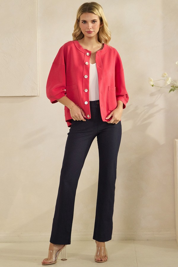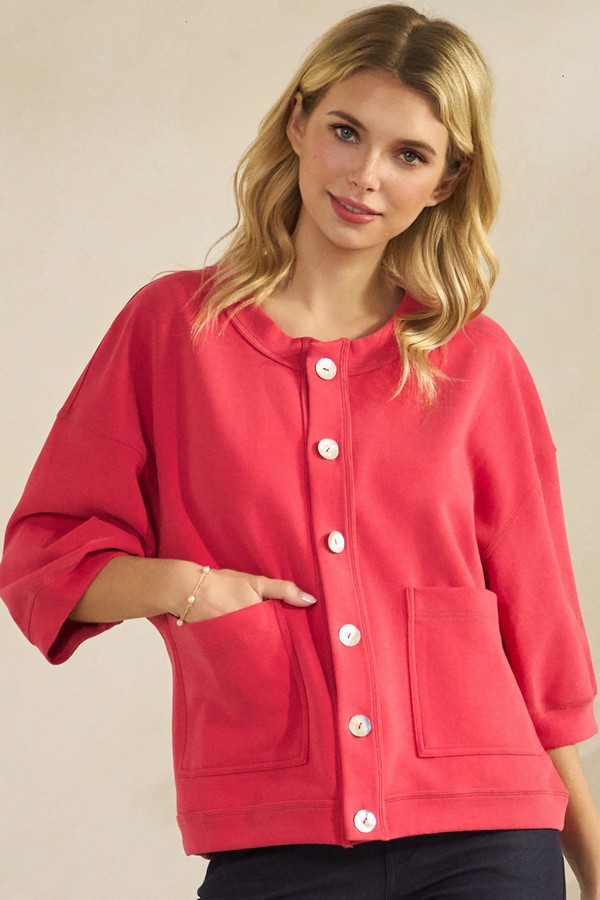 Detail Description: A modern cardigan with a relaxed silhouette, finished with a round neckline and three quarter sleeves for an easy, polished look. The varied buttons add a subtle touch of charm, while the spacious front pockets bring both function and personality. Lightweight and effortless to layer, it's a versatile piece that complements everyday outfits with understated style.