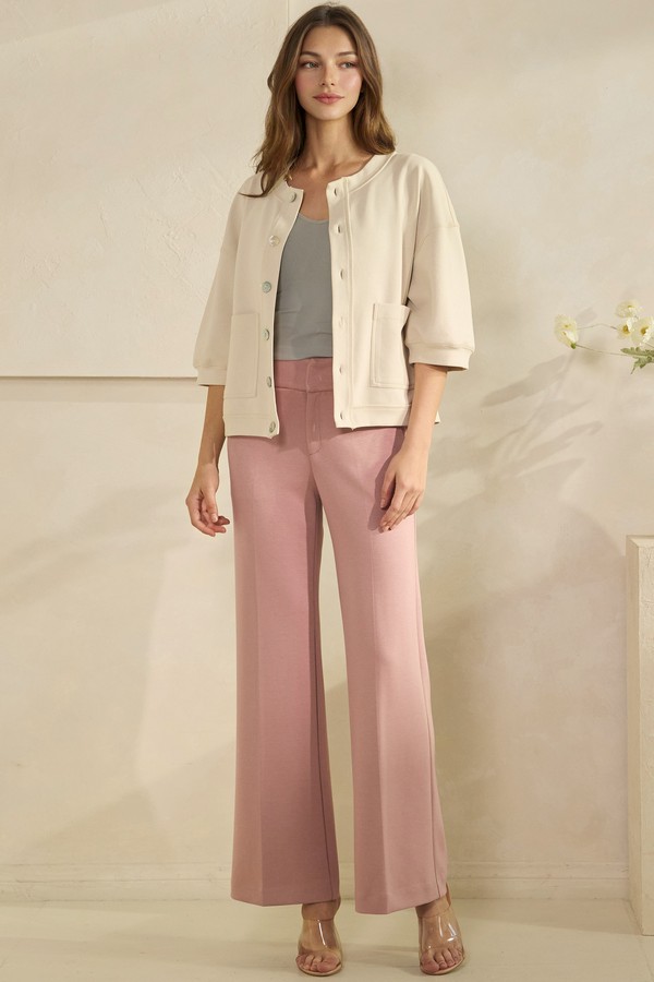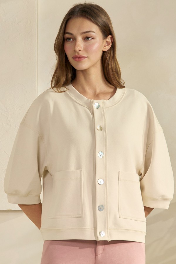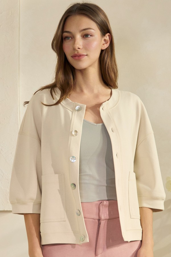 A modern cardigan with a relaxed silhouette, finished with a round neckline and three quarter sleeves for an easy, polished look. The varied buttons add a subtle touch of charm, while the spacious front pockets bring both function and personality. Lightweight and effortless to layer, it's a versatile piece that complements everyday outfits with understated style.