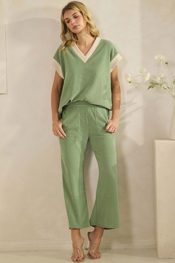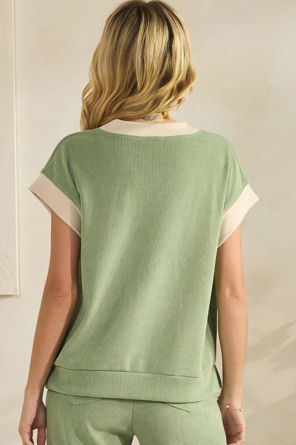 A modern take on casual comfort, crafted in a textured soft corduroy that elevates everyday wear. The V neckline is framed with sleek contrast detailing, while the fitted short sleeves add a refined touch. Its soft structure and ribbed finish create a flattering silhouette that pairs effortlessly with matching bottoms or your favorite staples for a chic, laid back look.