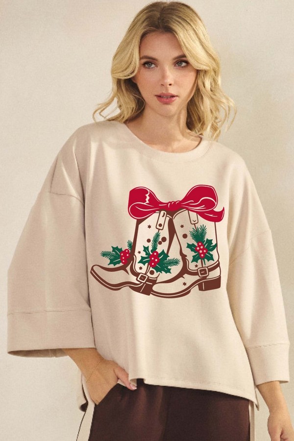 Wrap yourself with this cozy top. This statement-making style is your Go-To for effortless comfort. The soft pullover Top features a striking Christmas Boots in the center, making it Perfect for winter mornings and Holidays. The Wide sleeves and a relaxed fit silhouette make it perfect for layering over leggings or denim, while the premium Scuba Knit fabric keeps you warm without weighing you down. Designed for the woman who brings a touch of seasonal magic to every look.