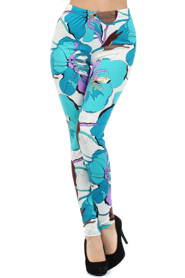 The Cubana Casa Baby Blue Lily print is a nice pair of leggings. There is a 1 inch elastic waistband with an 8 1/2 inch low-raise cut. The material content is consist of polyester, which is soft and smooth (inside and out). Also there is 5% spandex for flexibility and easy fitting. This material stretches comfortably to the contours of your body.