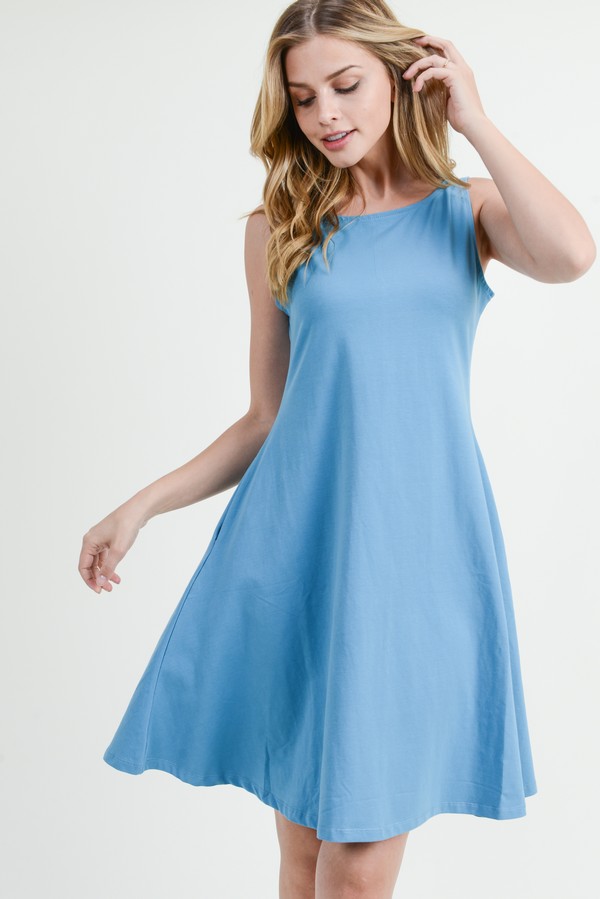 This adorable a-line dress features a sleeveless silhouette and two side pockets for carrying loose items.