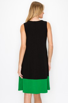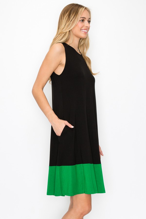 Wide scooped neckline, sleeveless loose fit a-line dress made with smooth rayon fabric. Color block trimmed hem.