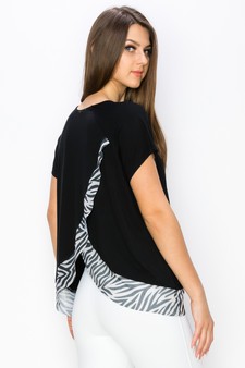 Add a touch of animal print to an everyday plain T-shirt. Sheer zebra print outlining the top in an asymmetrical pattern making this top more than just casual! Add some animal print to your closet this upcoming season!
