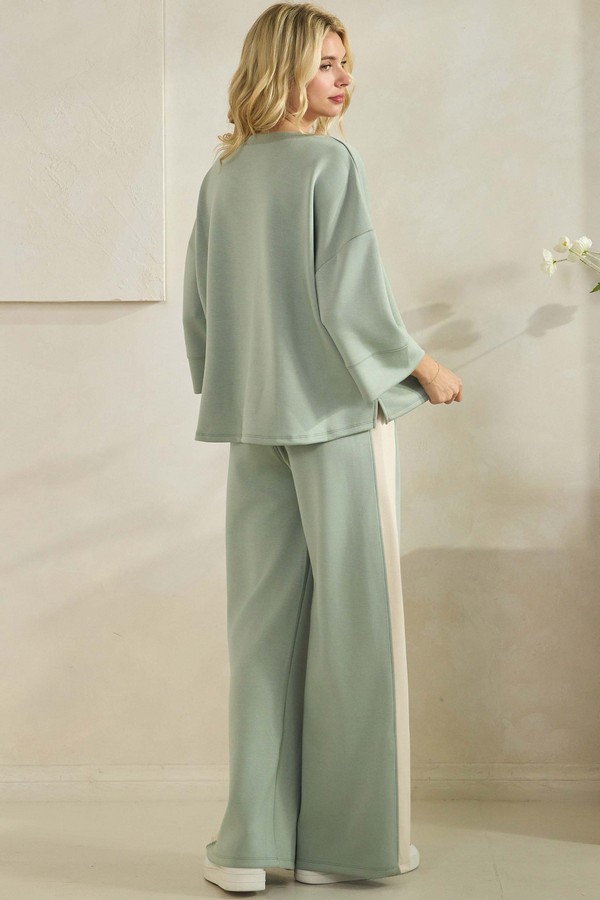 Embrace relaxed sophistication with this Relaxed Soft Set. The Relaxed Top features wide sleeves, and clean lines to create an effortlessly modern look, while the soft Two Tone Pants add a cozy, elevated touch. This top offers comfort without sacrificing style.