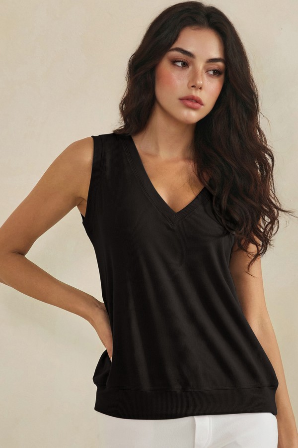 Effortlessly versatile and designed for everyday comfort, this ribbed tank top features a flattering V-neckline and a relaxed, easy drape. The soft, breathable fabric offers a lightweight feel, making it perfect for layering or wearing on its own. Finished with a subtly structured hem for added shape, this piece blends casual ease with a polished touch—ideal for both laid-back days and elevated basics styling.