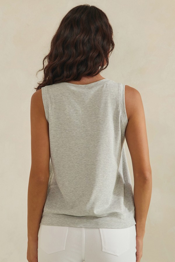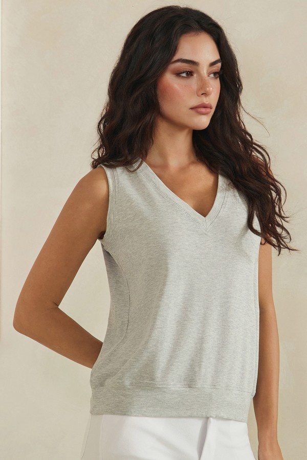Effortlessly versatile and designed for everyday comfort, this ribbed tank top features a flattering V-neckline and a relaxed, easy drape. The soft, breathable fabric offers a lightweight feel, making it perfect for layering or wearing on its own. Finished with a subtly structured hem for added shape, this piece blends casual ease with a polished touch—ideal for both laid-back days and elevated basics styling.