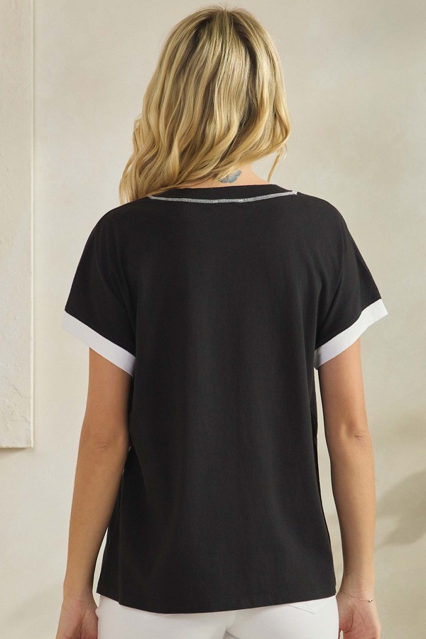 A minimalist essential with subtle edge. This short-sleeved tee features a crisp contrast trim at the collar and cuffs, adding sharp definition to its relaxed silhouette. Sculpted side seams contour the body with quiet precision, while the soft drape keeps the look effortless. Perfect for layering or standing alone—clean, modern, and endlessly versatile.