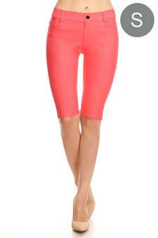 • Bermuda length shorts featuring a light sheen and jean-style construction