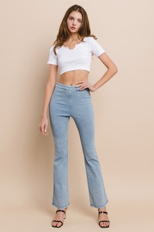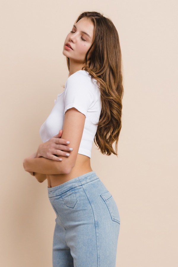 A Perfect Blend of Comfort and Style. Crafted from a textured ribbed fabric, this top offers a trendy and tactile appeal. The short sleeves add a casual touch, while the cropped length ensures a modern silhouette. Pair it with High-waisted bottoms for a fashion forward look or dress it down with your favorite jeans. Versatile and chic, this ribbed crop top is a must have for any wardrobe.