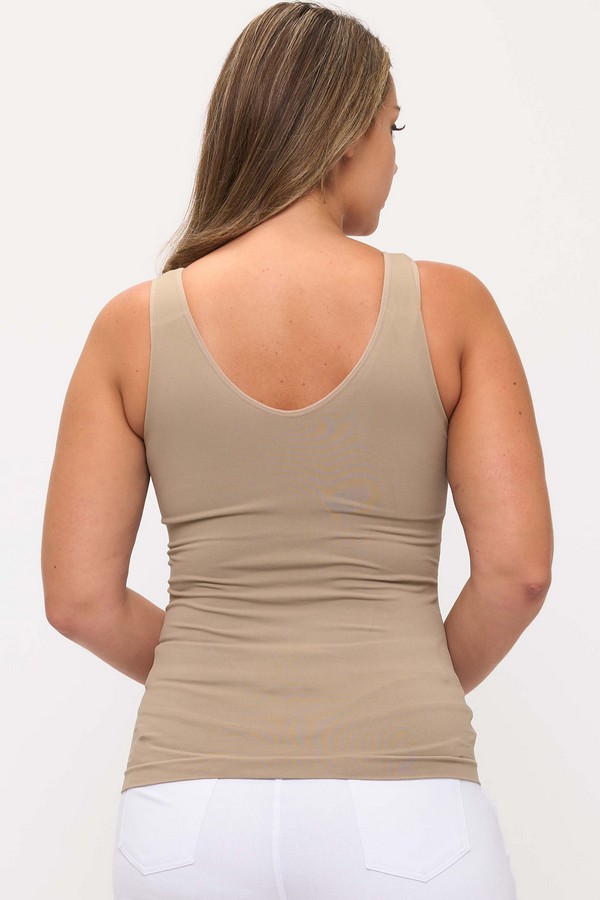 Effortless versatility meets everyday comfort in this reversible tank. Designed with a built-in bra for light support, it offers a sleek, smooth fit that flatters from every angle. Wear it with the scoop neck in front for a classic look, or flip it for a deeper neckline—two styles in one. Crafted from soft, stretchy fabric, this tank is perfect for layering under jackets or wearing solo with jeans, shorts, or skirts. A timeless staple you’ll reach for again and again.