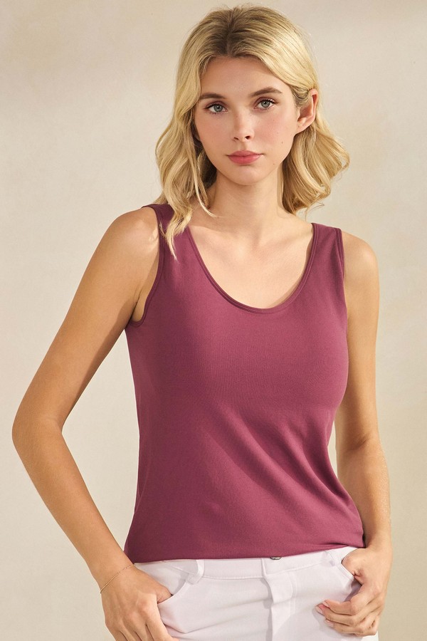 Detail Description: Effortless versatility meets everyday comfort in this reversible tank. Designed with a built-in bra for light support, it offers a sleek, smooth fit that flatters from every angle. Wear it with the scoop neck in front for a classic look, or flip it for a deeper neckline—two styles in one. Crafted from soft, stretchy fabric, this tank is perfect for layering under jackets or wearing solo with jeans, shorts, or skirts. A timeless staple you’ll reach for again and again.