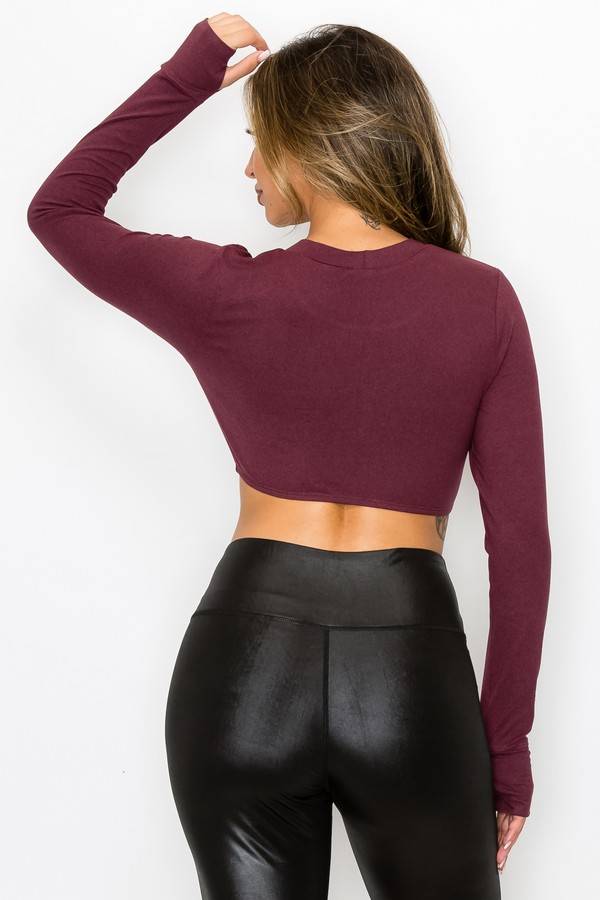 Feel empowered through your workout gear. This crop top features a U-neckline and long sleeves with a thumb hole. Super flattering and form fitting top, definitely an active wear essential. This top can also be paired with jeans for a street-chic look.