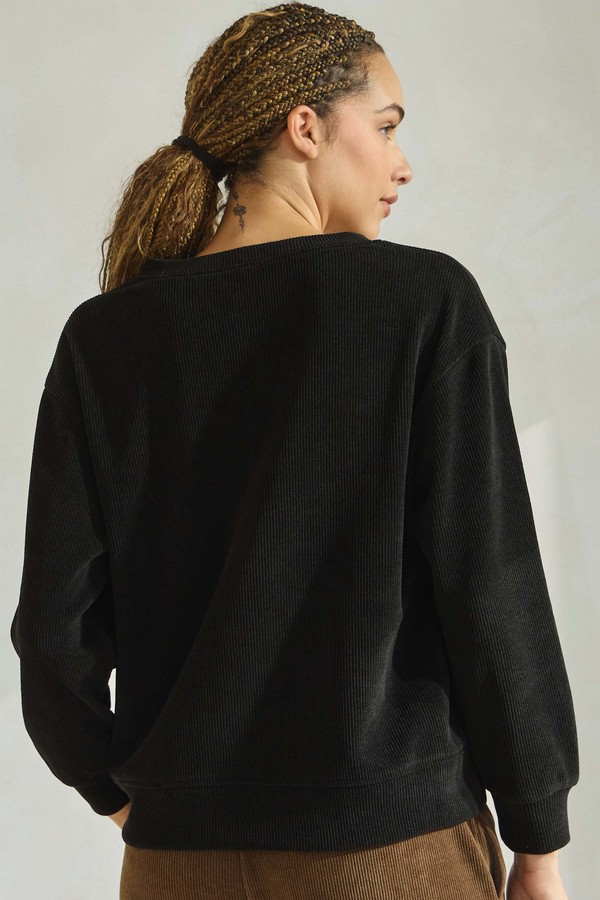 Elevate your casual style with our Relaxed Ribbed V Neck Long Sleeve Top. A relaxed-fit long sleeve top in soft corduroy rib-knit fabric. Dropped shoulders, long sleeves and ribbing at the cuffs.