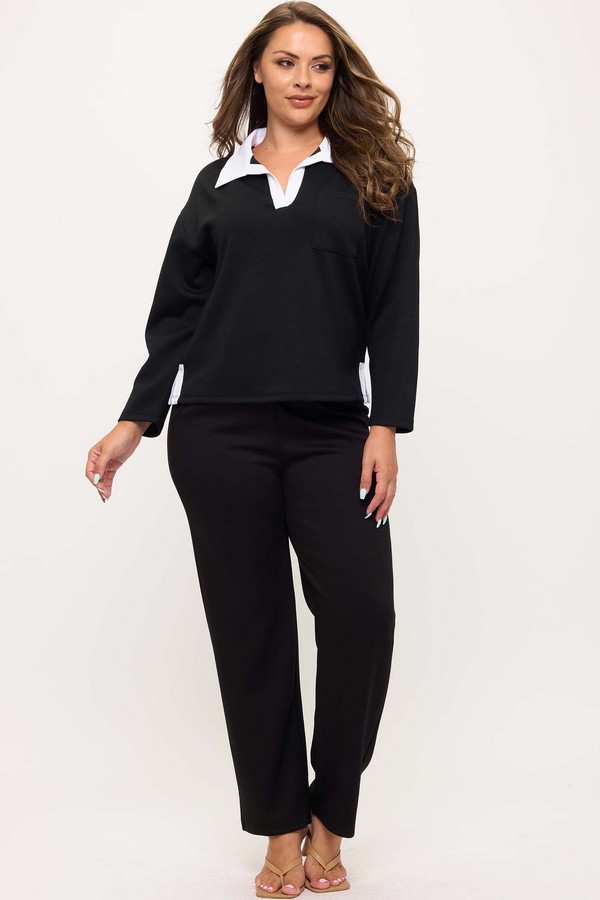Classic and Sleek, this two-piece set redefines modern minimalism. The collared top, accented with a sharp white contrast and a single chest pocket, introduces a tailored note to its relaxed cut. Wide-leg Bottoms flow with ease, creating a silhouette that feels both commanding and effortless. Perfect for the woman who values polish without sacrificing comfort, this ensemble moves fluidly from creative workspace to evening gatherings.
