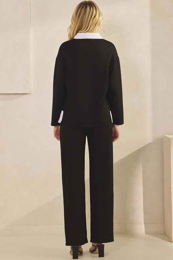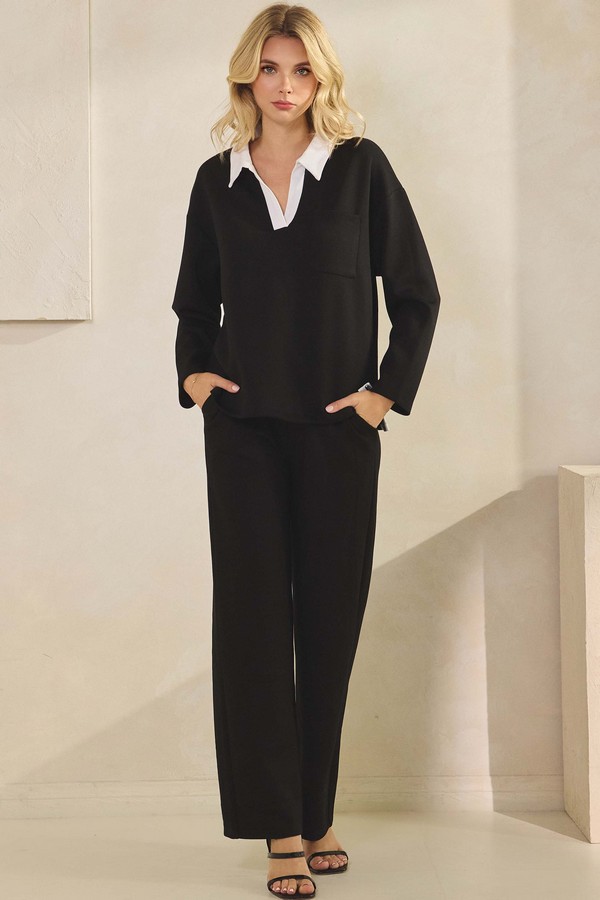 Classic and Sleek, this two-piece set redefines modern minimalism. The collared top, accented with a sharp white contrast and a single chest pocket, introduces a tailored note to its relaxed cut. Wide-leg Bottoms flow with ease, creating a silhouette that feels both commanding and effortless. Perfect for the woman who values polish without sacrificing comfort, this ensemble moves fluidly from creative workspace to evening gatherings.