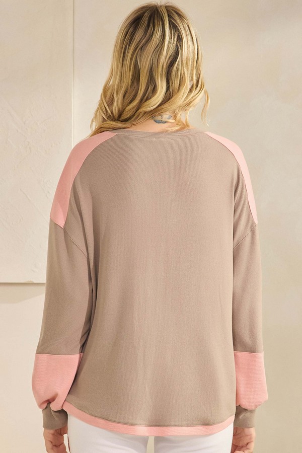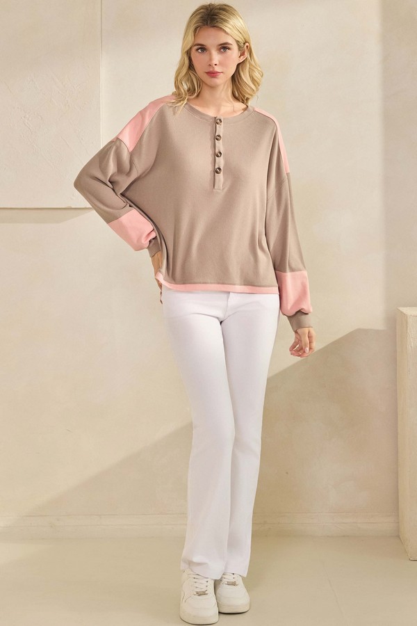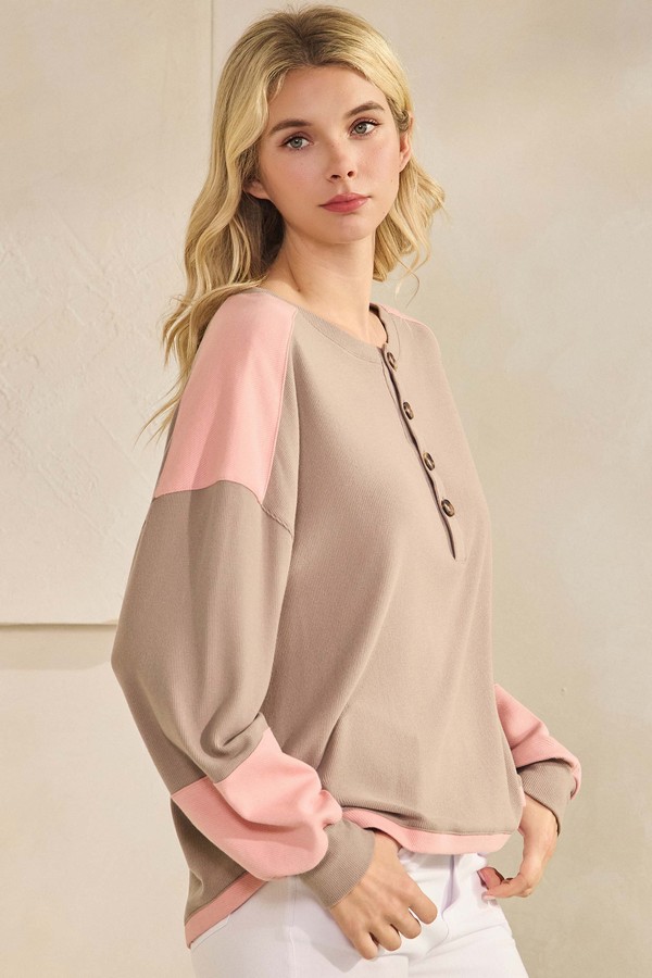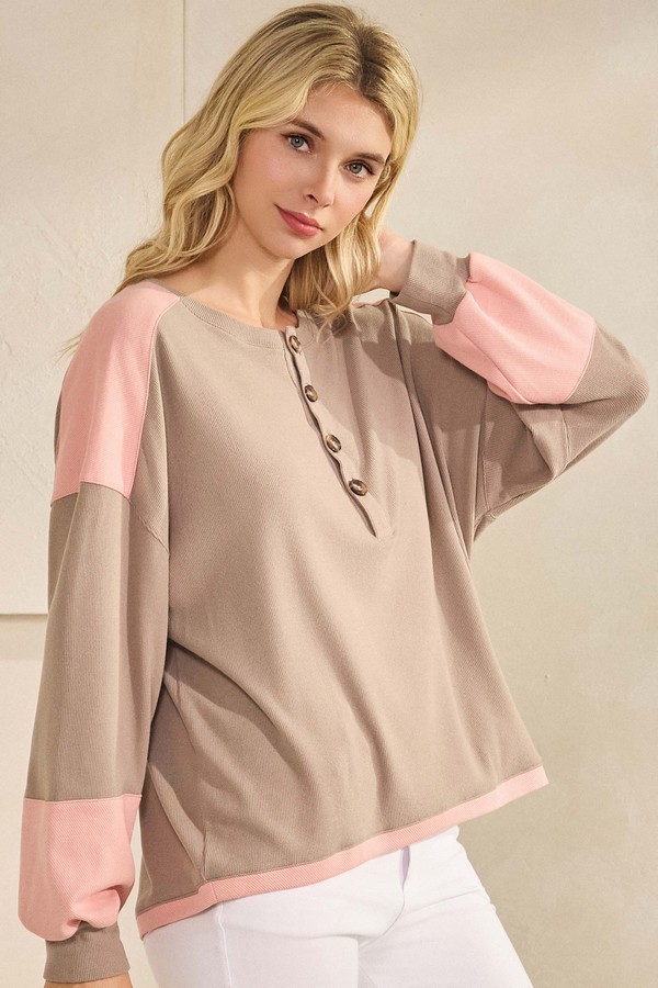 ETA 10/23/25 - Women's Two Tone Ribbed Loose Fit Top with Buttons