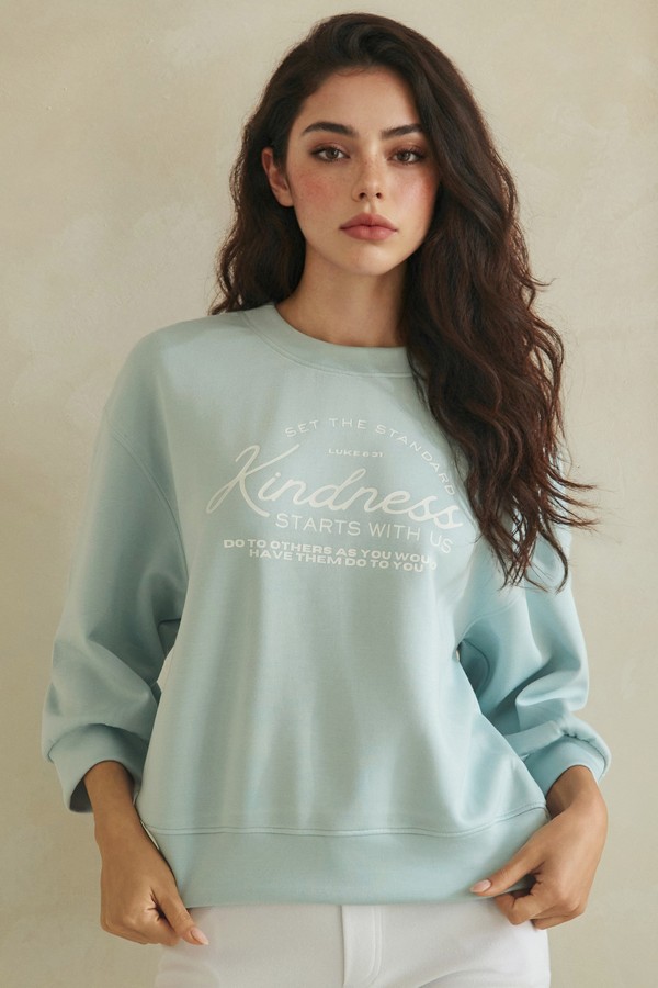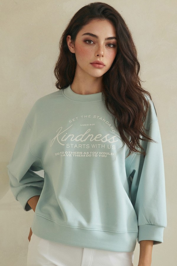 This relaxed-fit pullover sweatshirt blends everyday comfort with a meaningful message. Designed with a classic crew neckline, soft-touch fabric, and gently structured sleeves, it delivers a cozy yet polished silhouette perfect for casual styling. The uplifting front graphic adds a thoughtful statement that makes this piece both stylish and expressive. Ideal for pairing with denim, joggers, or layered looks for effortless wear throughout the day.