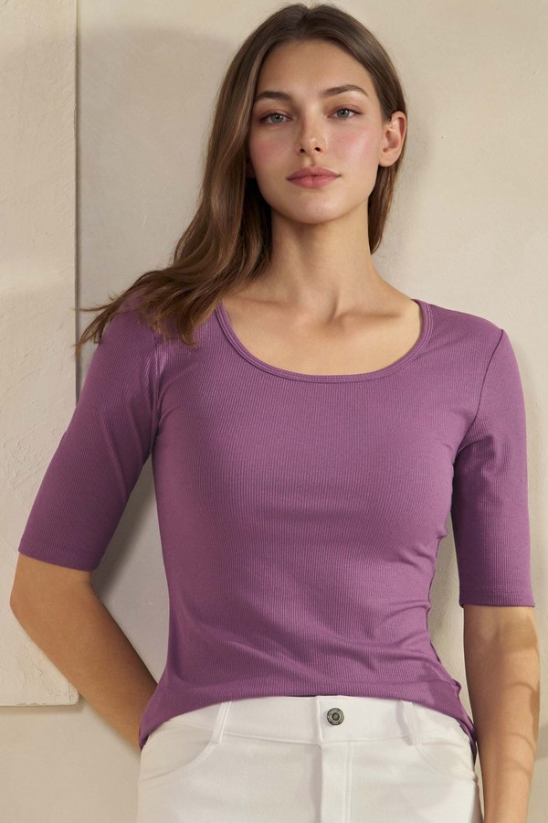 A minimalist essential with subtle texture and sculpted ease. This fitted scoop-neck top features a fine ribbed knit that hugs the body with soft stretch, Mid sleeves that balance coverage and breathability, and a clean neckline that flatters without fuss. Designed for layering or solo wear, it’s your go-to for elevated basics with a modern edge.