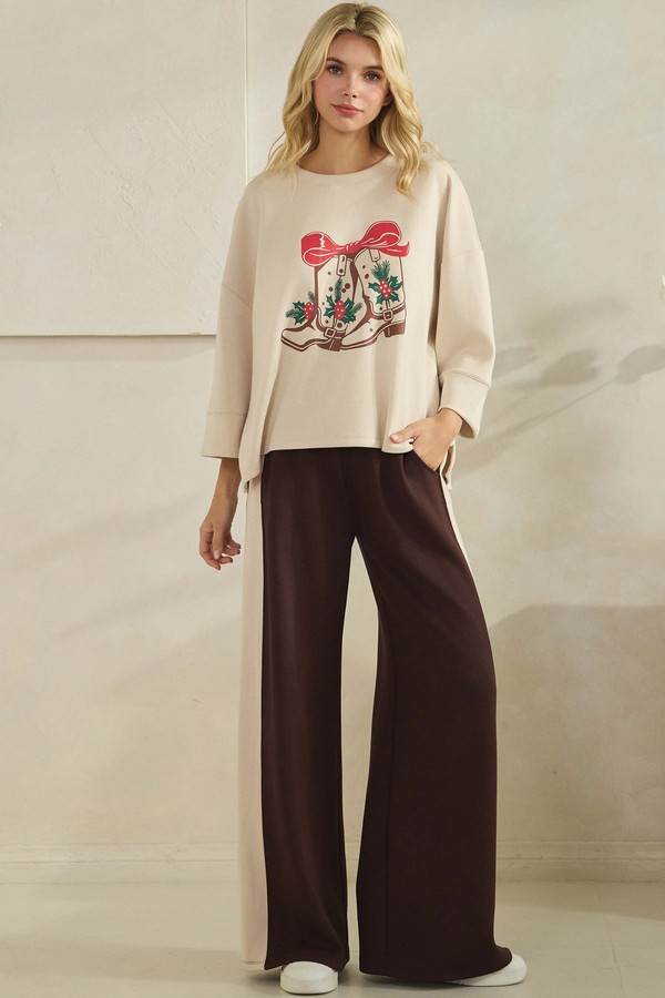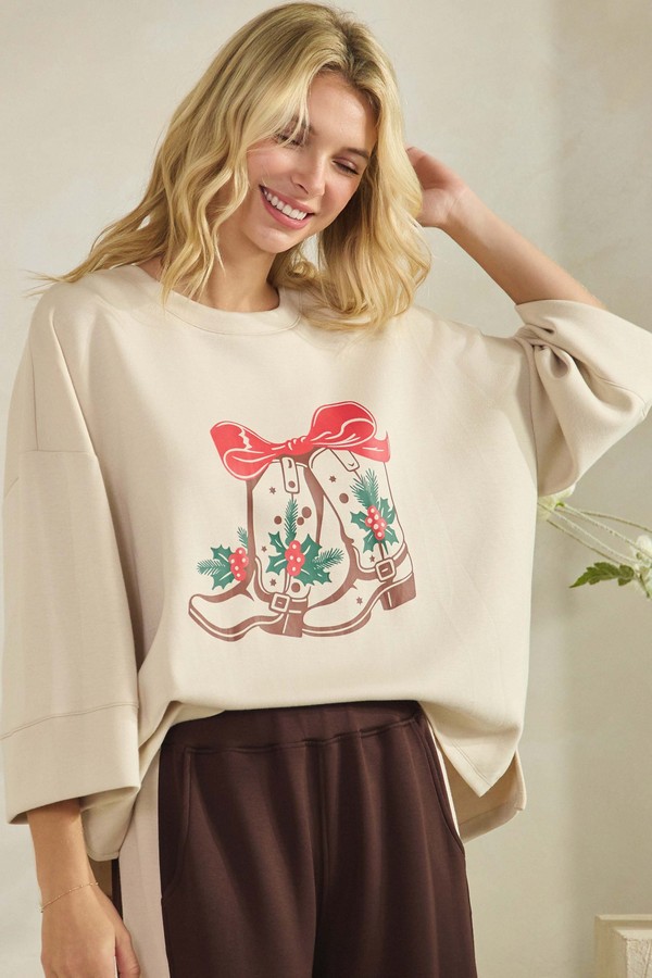Wrap yourself with this cozy top. This statement-making style is your Go-To for effortless comfort. The soft pullover Top features a striking Christmas Boots in the center, making it Perfect for winter mornings and Holidays. The Wide sleeves and a relaxed fit silhouette make it perfect for layering over leggings or denim, while the premium Scuba Knit fabric keeps you warm without weighing you down. Designed for the woman who brings a touch of seasonal magic to every look.