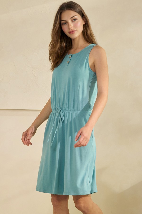 Detail Description: Stay polished and comfortable in this sleeveless everyday dress designed with flattering and functional details. Featuring a classic round neckline with a button-front accent, an adjustable drawstring waist for a customizable fit, and convenient side pockets, this easygoing silhouette transitions seamlessly from casual outings to relaxed weekends. The soft drape and knee-length cut create a timeless look that’s both practical and stylish.