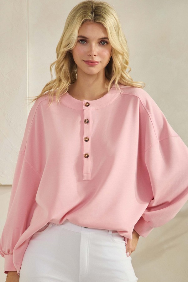 Soft structure meets everyday ease in this Sofie Soft long-sleeve top. Designed with a relaxed silhouette and subtly puffed sleeves, it features a round neckline and a Four-button placket with warm brown accents. The gathered cuffs add a gentle finish, balancing comfort with a touch of polish. Pair it with your favorite leggings or Jeans for a look that moves effortlessly from casual to styled.