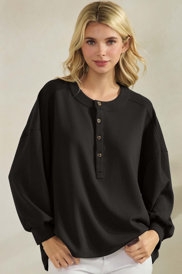 Soft structure meets everyday ease in this Soft long-sleeve top. Designed with a relaxed silhouette and subtly puffed sleeves, it features a round neckline and a Four-button placket with warm brown accents. The gathered cuffs add a gentle finish, balancing comfort with a touch of polish. Pair it with your favorite leggings or Jeans for a look that moves effortlessly from casual to styled.