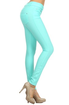 • Full length jeggings featuring a light sheen and jean-style construction
