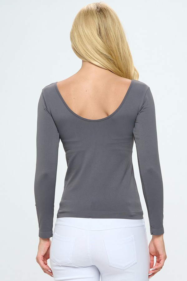 Add this to your basics during the cool weather. The seamless design is so easy to pull on and molds to your body giving you a flattering and supportive fit. This top is reversible so it can be worn with a wide scooped neckline for a completely new look. A two in one top that you will not be able to take off.