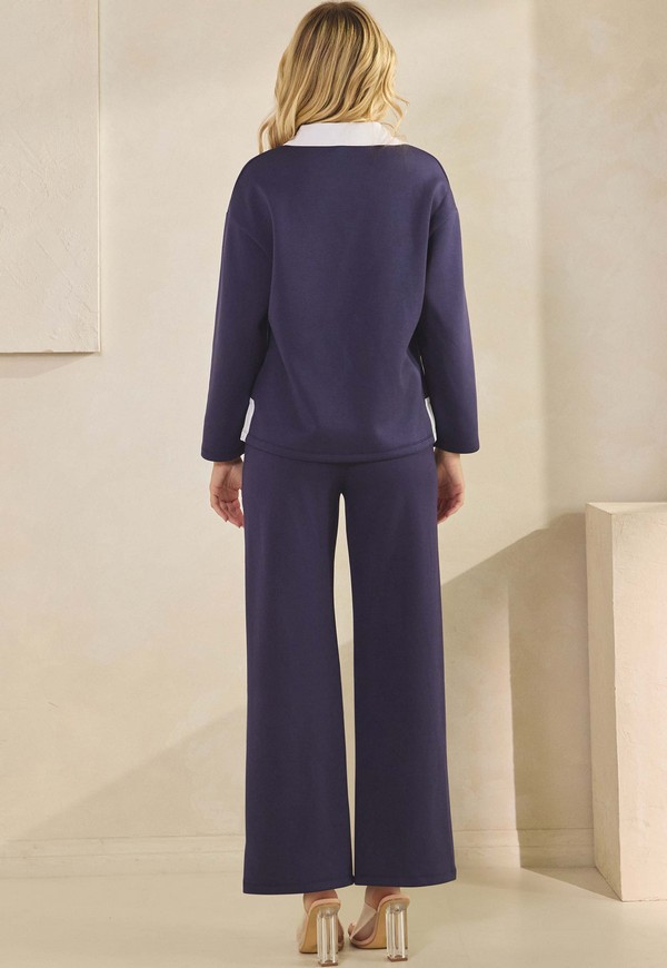 Classic and Sleek, this two-piece set redefines modern minimalism. The collared top, accented with a sharp white contrast and a single chest pocket, introduces a tailored note to its relaxed cut. Wide-leg Bottoms flow with ease, creating a silhouette that feels both commanding and effortless. Perfect for the woman who values polish without sacrificing comfort, this ensemble moves fluidly from creative workspace to evening gatherings.