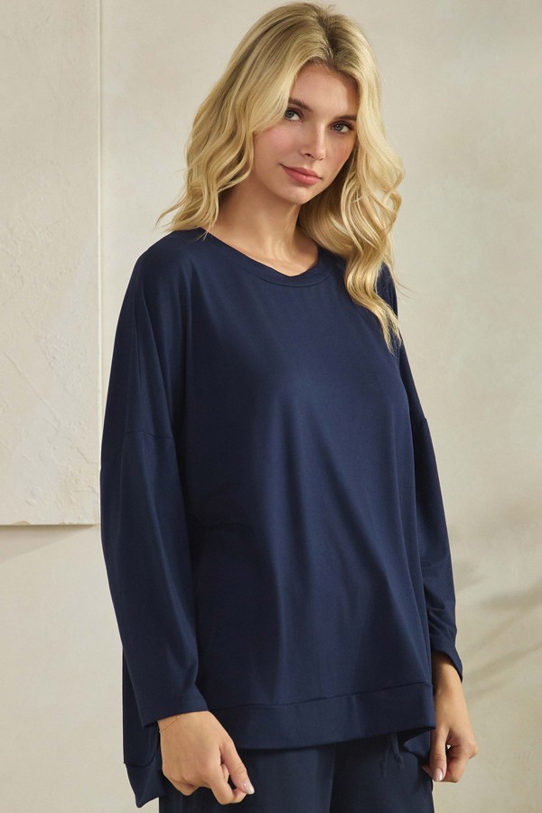 Effortless style meets all-day comfort in this everyday essential. Designed with a relaxed fit, slouchy long sleeves, and a round neckline. The drop-shoulder silhouette adds a modern, laid-back edge. Perfect to style with your favorite lounge pants, joggers, or denim, everything from lounging to casual streetwear.