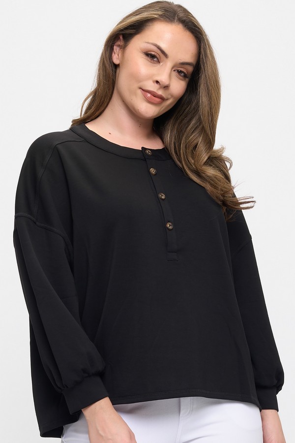 Soft structure meets everyday ease in this Soft long-sleeve top. Designed with a relaxed silhouette and subtly puffed sleeves, it features a round neckline and a Four-button placket with warm brown accents. The gathered cuffs add a gentle finish, balancing comfort with a touch of polish. Pair it with your favorite leggings or Jeans for a look that moves effortlessly from casual to styled.