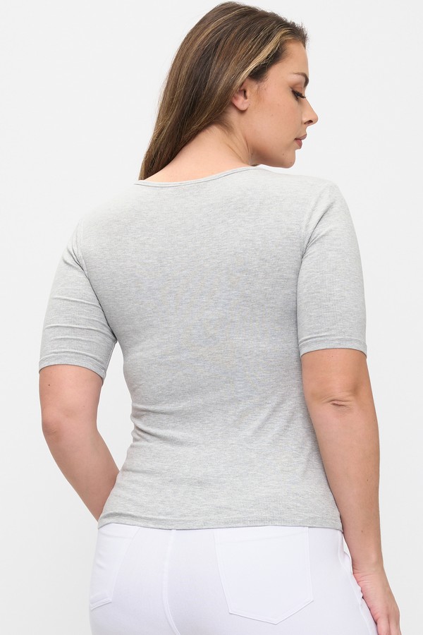 A minimalist essential with subtle texture and sculpted ease. This fitted scoop-neck top features a fine ribbed knit that hugs the body with soft stretch, Mid sleeves that balance coverage and breathability, and a clean neckline that flatters without fuss. Designed for layering or solo wear, it’s your go-to for elevated basics with a modern edge.