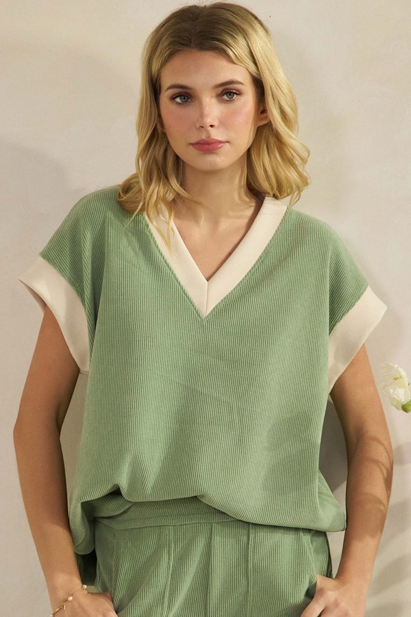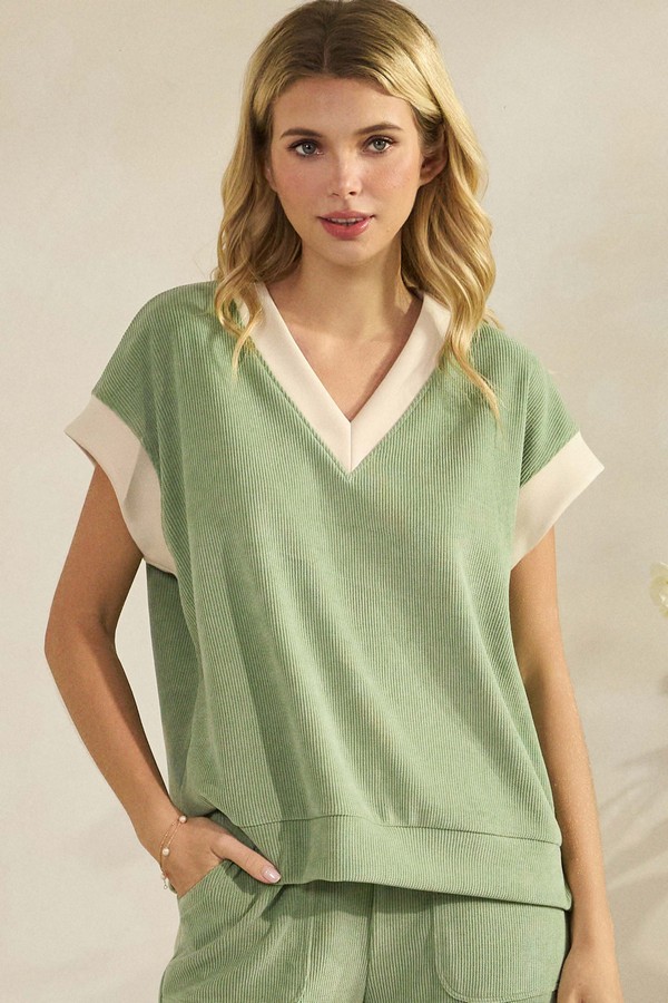 A modern take on casual comfort, crafted in a textured soft corduroy that elevates everyday wear. The V neckline is framed with sleek contrast detailing, while the fitted short sleeves add a refined touch. Its soft structure and ribbed finish create a flattering silhouette that pairs effortlessly with matching bottoms or your favorite staples for a chic, laid back look.