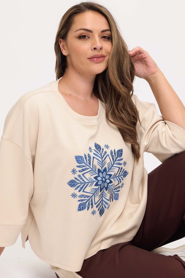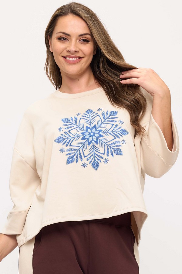 Wrap yourself with this cozy top. This statement-making style is your Go-To for effortless comfort. The soft pullover Top features a striking geometric blue snowflake at the center, making it Perfect for winter mornings and Holidays. The Wide sleeves and a relaxed fit silhouette make it perfect for layering over leggings or denim, while the premium Scuba Knit fabric keeps you warm without weighing you down. Designed for the woman who brings a touch of seasonal magic to every look.