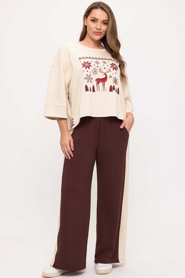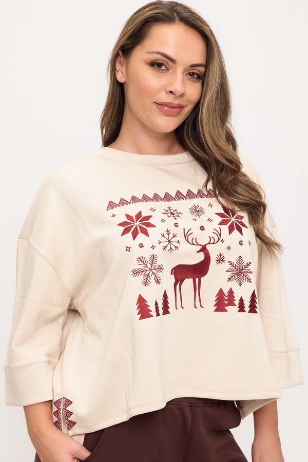 Step into the magic of winter with this UltraComfy Top. It's adorned with a festive red design of a prancing reindeer, delicate snowflakes, and pine-tree accents, capturing the charm of a snowy holiday scene. Crafted from ultra-soft, mid-weight fabric with wide sleeves and a relaxed fit, it wraps you in all-day coziness while making a joyful seasonal statement. Perfect for fireside lounging, holiday gatherings, or adding a touch of festive cheer to your everyday style.