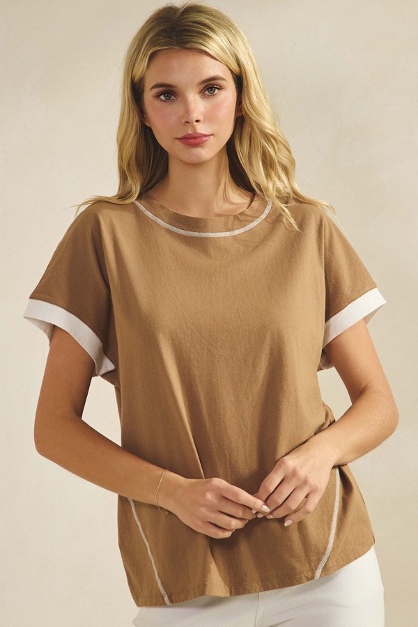 A minimalist essential with subtle edge. This short-sleeved tee features a crisp contrast trim at the collar and cuffs, adding sharp definition to its relaxed silhouette. Sculpted side seams contour the body with quiet precision, while the soft drape keeps the look effortless. Perfect for layering or standing alone—clean, modern, and endlessly versatile.